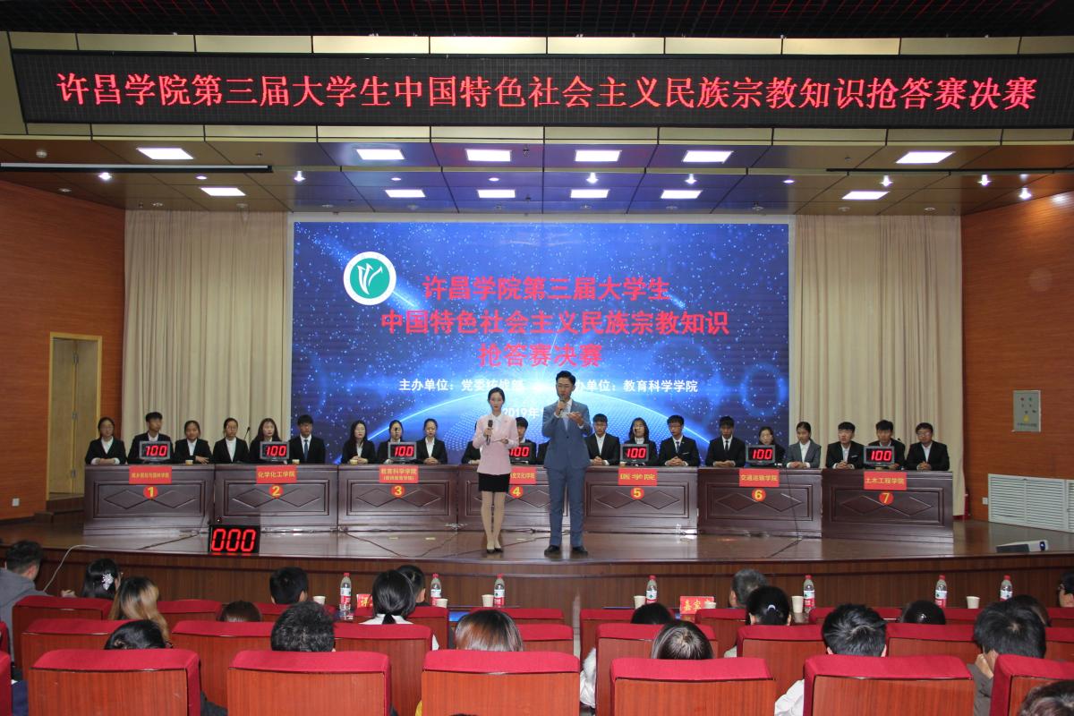 2019年11月29日下午,由党委统战部主办、教育科学学院承办的许昌学院第三届大学生中国特色社会主义民族宗教知识抢答赛决赛在学术报告厅举办,教育科学学院代表队入围此次决赛。