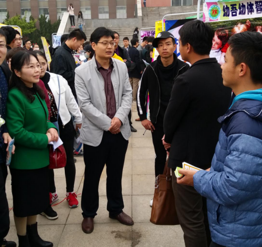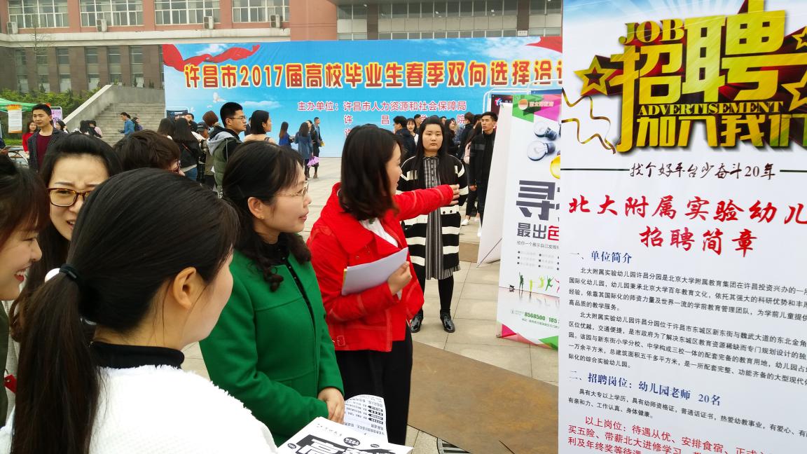 4月8日上午八点,由许昌市人力资源和社会保障局、许昌学院、许昌职业技术学院联合举办的许昌市2017届高校毕业生春季双向选择洽谈会在我校弘毅广场举行。我院党总支副书记李晓鹏、毕业班辅导员袁朝阳、就业专干教师张谦以及部分应届毕业生参加了此次双选会,现场与用人单位进行洽谈交流。