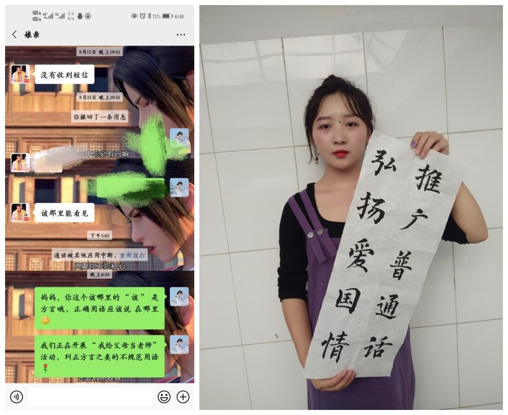 18日,我院开展“我给父母当老师”活动,鼓励学生运用在学校所学的知识,纠正生活中存在方言及不正确用字的现象,实现一个学生带动家庭,实现推普两级跳。
