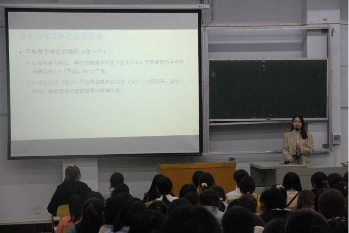 教学秘书张艺蝶老师带领同学们进行了学习规章制度解读,对通识类课程、专业课程、创新创业课程进行了介绍,并着重讲述了毕业资格与学位证的获得条件,激励同学们树立明确目标,合理规划学习生活。