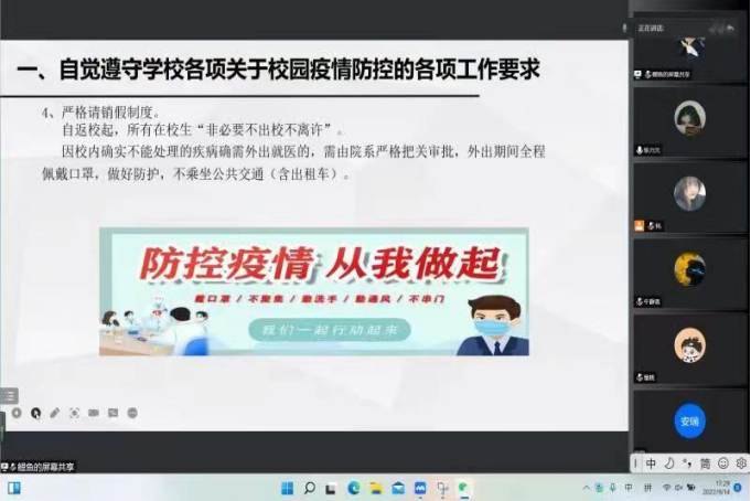 同时,团委书记李征还以2022级教育学院新生辅导员的身份,专门为新生召开了“同心抗疫,共护校园”的线上主题教育活动,在会上,团委书记李征详细介绍了国内疫情形势以及如何科学防疫,教导新生共同守护健康校园。