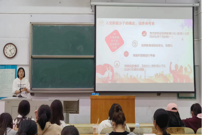 教育学院组织员刘馨婷老师为同学们做了《中国共产党入党标准及入党流程》讲座。她围绕合格的中国共产党员标准及入党流程向同学们讲解了入党积极分子的确定培养及考察、发展对象的确定和预备党员的接收工作等重要知识内容。为同学们入党提供极大帮助,并激励同学们敢于奋斗,勇于担当,努力争做新时代具有责任意识和创造精神的建设者。