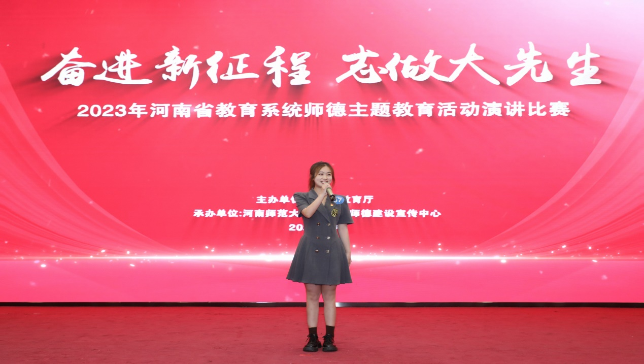2023年6月17-18日,河南省教育系统师德主题教育活动“奋进新征程,志做大先生”演讲比赛在河南师范大学如期举行。本次比赛有142名选手参赛,经过两天的激烈角逐,共决出70名一等奖。其中教师组47名,学生组23名。