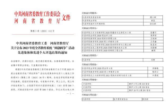 近日,中共河南省委教育工委、河南省教育厅印发《关于公布2023年度全省教育系统“两创两争”活动先进集体和先进个人评选结果的通知》(豫教工委〔2023〕112号),对2023年度全省教育系统“两创两争”活动先进集体和先进个人进行表彰,我院喜获多项荣誉。
