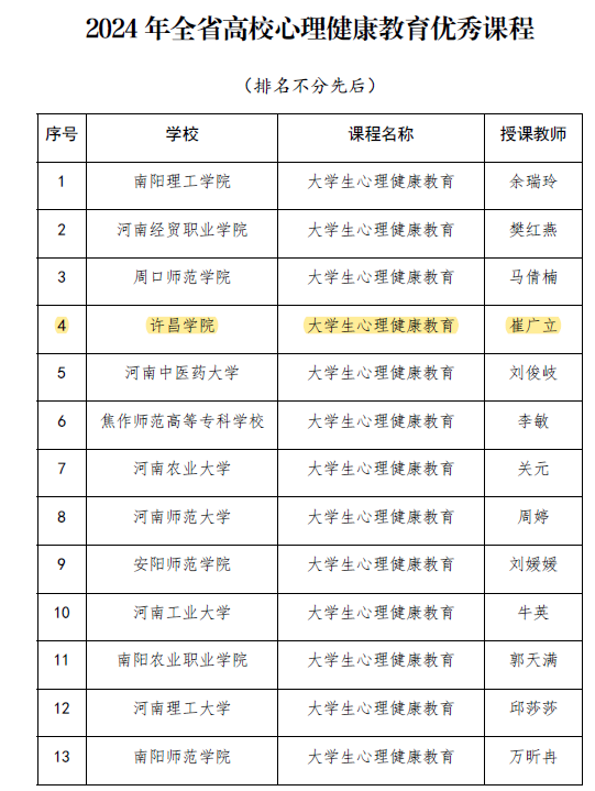 近日,河南省委教育工委、河南省教育厅公布了2024年全省高校大学生心理健康教育优秀课程遴选结果,我院崔广立老师申报的《大学生心理健康教育》课程获评“河南省高校心理健康教育优秀课程”。据悉,这是继去年以来,我院教师连续两年获评“河南省大学生心理健康教育优秀课程”。
