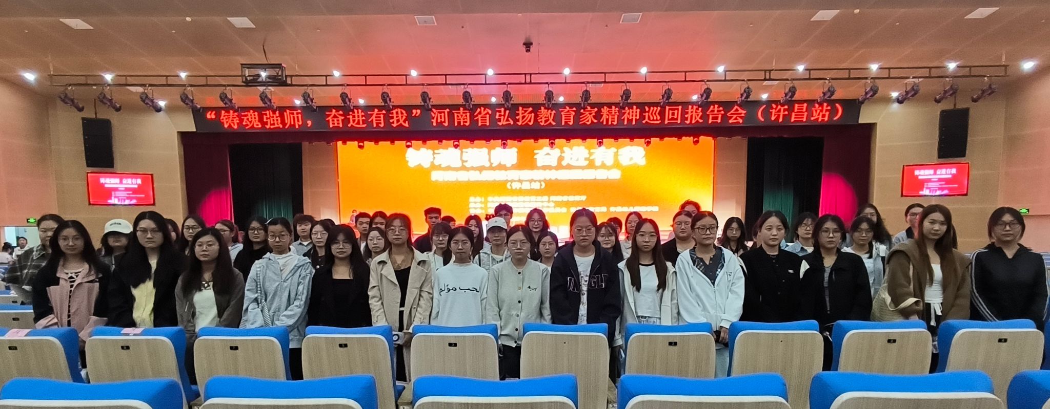 2025年9月19日下午,由河南省委教育工委、省教育厅主办的“铸魂强师,奋进有我”弘扬教育家精神巡回报告会(许昌站)在许昌市职教园区大礼堂隆重举行。我院积极响应学校与市教育局号召,组织小学教育、学前教育专业50名师范生代表参会,接受了一次深刻的师德教育与精神洗礼。