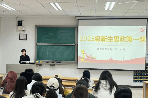 为引导广大新生坚定理想信念、明确发展方向、科学规划未来,进一步深入学习贯彻党的二十届四中全会精神,10月28日晚,教育学院党委书记韦薇以“携青春梦想,赴崭新征程”为主题,为我院2025级全体新生讲授了一堂内容丰富、思想深刻、富有感染力的开学第一堂思政课。