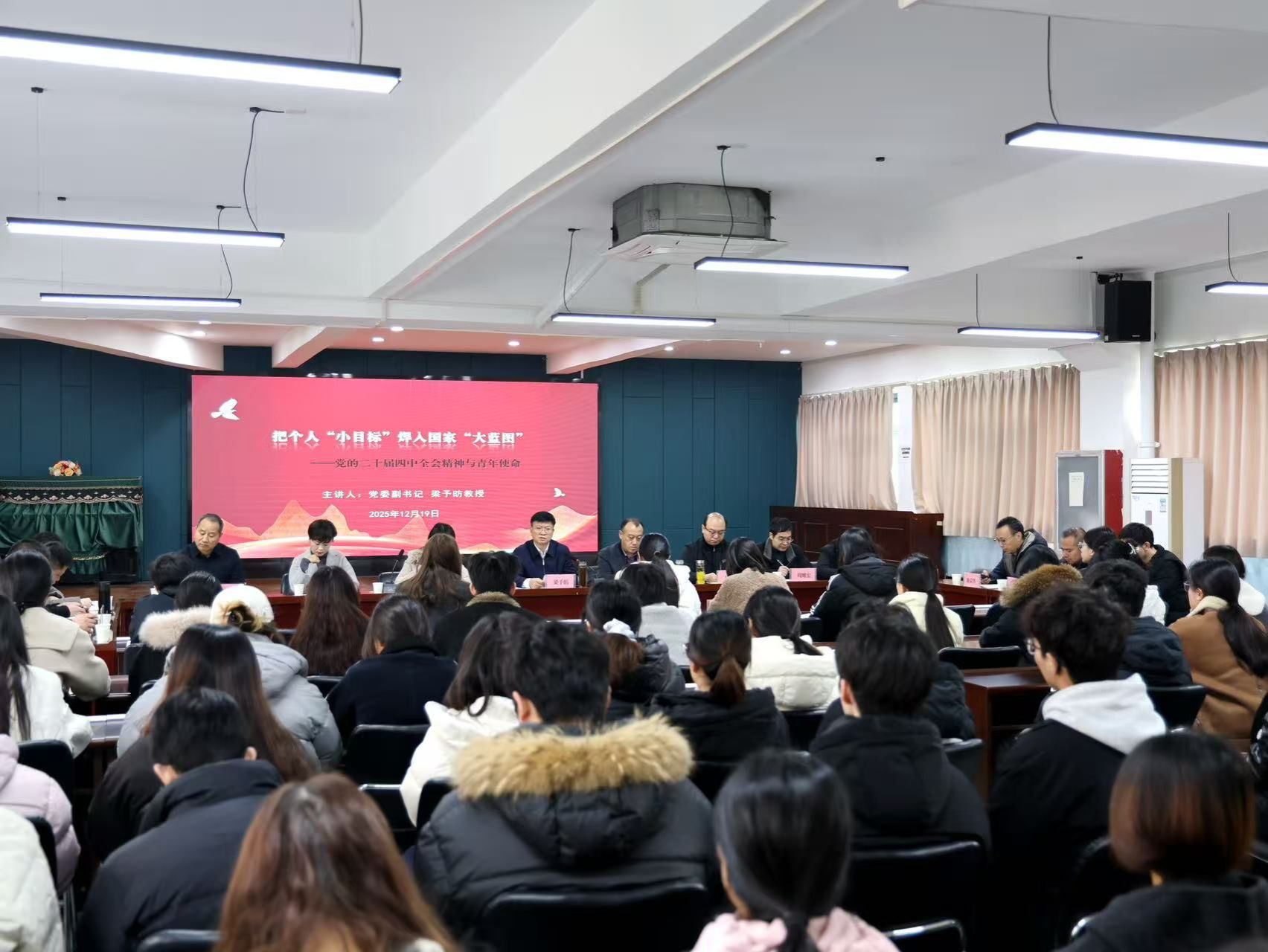12月19日上午,校党委副书记、工会主席梁予昉来到弘毅书院报告厅,为党委宣传部、马克思主义学院、商学院、教育学院师生宣讲党的二十届四中全会精神,并与师生深入交流。会议由马克思主义学院党委书记谢依楠主持。
