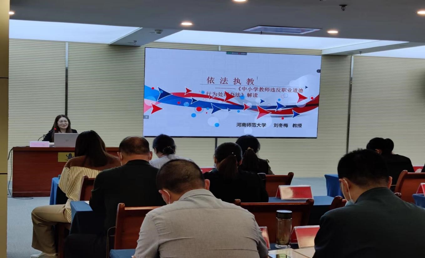 2022年9月27日下午,我校邀请到河南师范大学刘冬梅教授为国培学员上课,教授通过解读《中小学教师违反职业道德行为处理办法》向学员们介绍了教师的职业性质,法律身份,教师的权利与义务等。