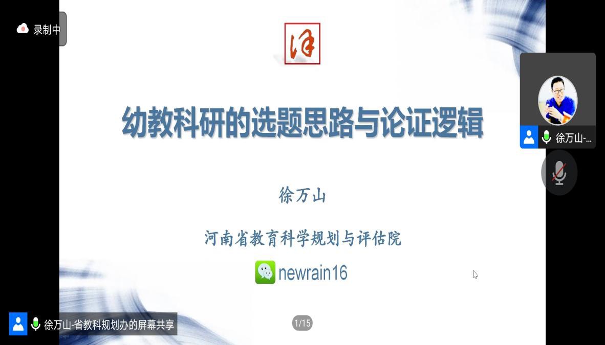 教育科研课题的选题原则,科学性原则要有,教育科学一句符合教育规则和国家法规政策;价值性原则有益于教育教学理论发展,有益于教育教学改革的推进,有益于教育教学质量提升,有益于儿童的身心健康和谐发展;创新性原则,新概念、新观点、新方法、新技术、新应用和新例证,创新是课题研究的生命;可行性原则,主观条件兴趣经验能力,客观条件资料设备人才经费和研究实际条件成熟环境允许,徐万山老师将其概括为正确、新颖、可行和有用。整节讲座下来,徐万山教授为学员老师们讲解了幼教科研的选题思路和论证逻辑,学员老师对科研的选题思路更加清晰。(图文:李帆 审核:韦薇、张笑涛)