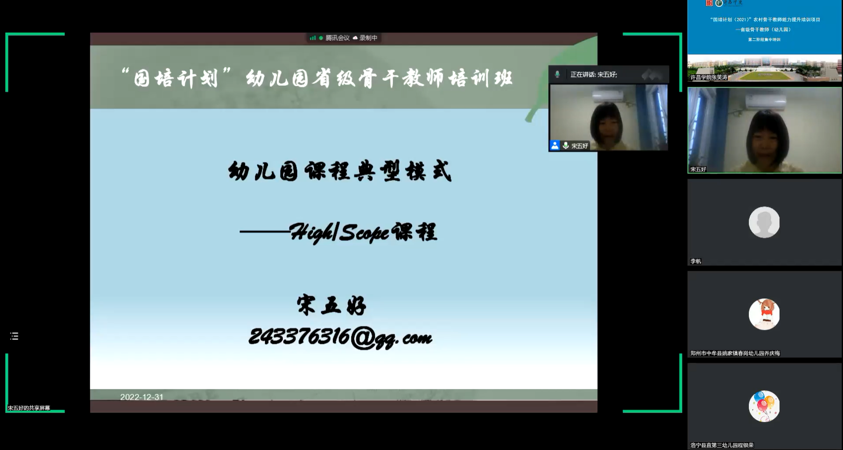 2022年12月31日上午,我们邀请到了西安文理学院学前教育学院实验教学中心主任,陕西师范大学兼职硕士生导师,“国培计划”学前教育专家,陕西省高等学校教学指导委员会、学前教育类工作委员会委员、省级学术技术带头人、西安市学前教育指导专家、市级优秀教师宋五好教授为国培学员带来一场“幼儿园课程典型模式--High Scope 课程”专题讲座。