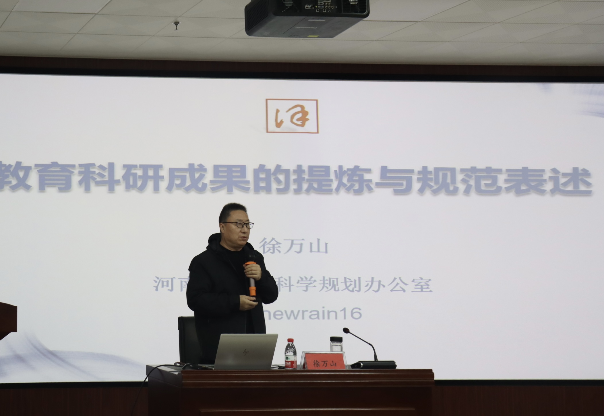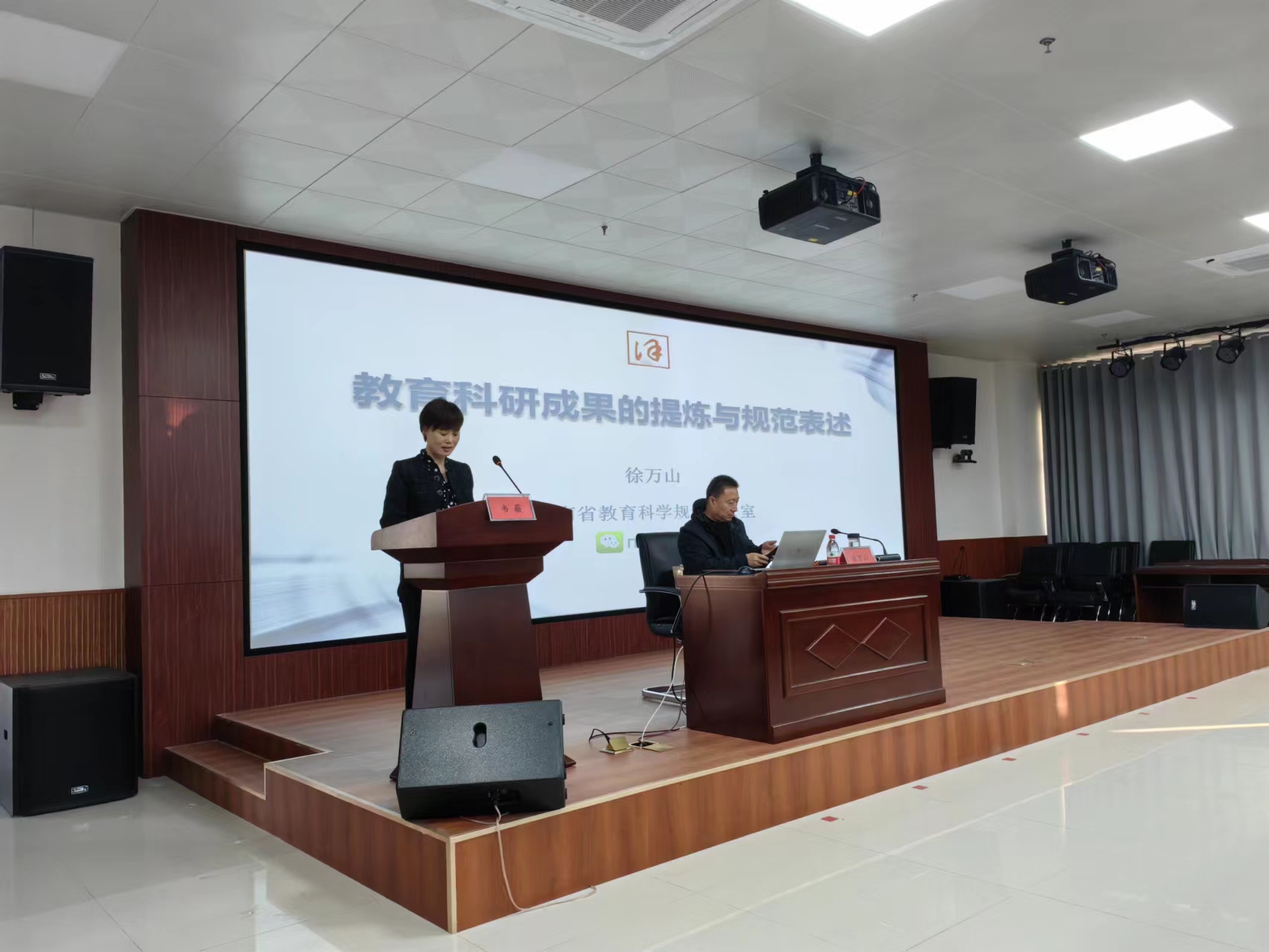 徐万山教授的报告主题是“教育科研成果的提炼与规范表述”,主要从教育科研成果的定义、原则、提炼的基本要求等方面,让学员们了解将自己的实际工作中的亮点和成果转化为教育课题研究的方法,并鼓励学员们在日常工作中去发现和解决与实际问题高度相关的教育问题。