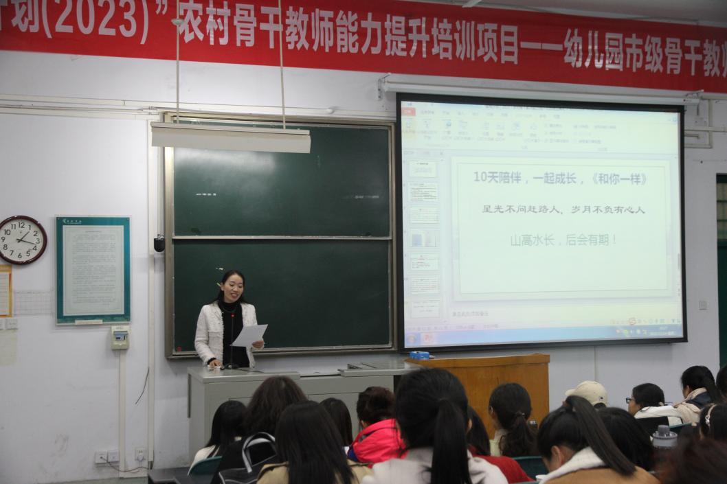 2023年11月14日教育学院承办的“国培计划(2023)”农村骨干教师能力提升项目的省、市级幼儿园骨干教师及小学心理健康骨干教师三个培训班的结业典礼,在A合十六教室举行。教育学院副院长张笑涛、教育学院教研室主任徐来群、本期培训班的班导师及全体参训学员参加。结业典礼由教育学院教研室主任徐来群主持。