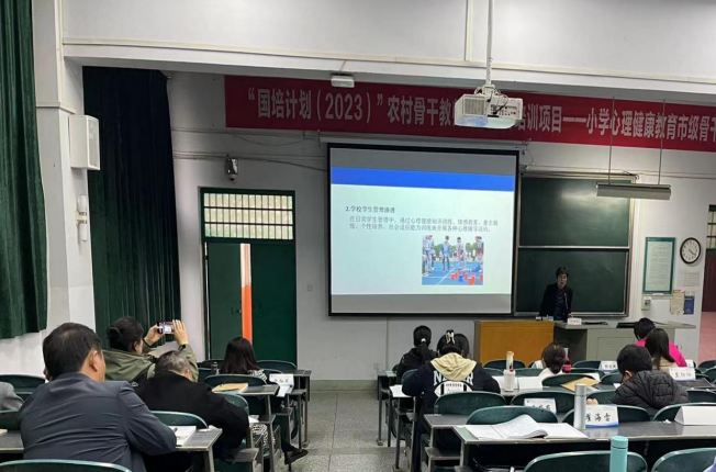2023 年 11 月 9 日下午,许昌市未成年人心理健康教育辅导中心 主任孔丽红老师应邀为国培班学员开展了一场题为《如何在小学开展 心理健康教育》的讲座,本场讲座由国培班导师周海谦主持。