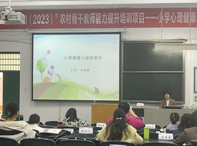 2023 年 11 月 9 日上午,河南普树教育创始人,北京学知无涯教 育首席执行——李俏燕老师为国培学员做了一场题为《心理健康与家 庭教育》的专题讲座,国培项目班主任冯建成老师主持。