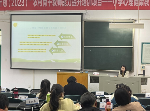 2023 年 11 月 8 日下午,许昌市示范区实验学校教师、许昌市示 范区心理健康教研组长——张冰老师为国培学员做了一场题《心理健康教育课程设计与实施》的专题讲座,班导师周海谦老师主持。