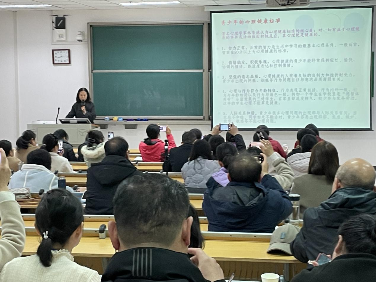 宋老师从国家一系列的政策法规和当下中国儿童生存与发展的数据出发,指出了中小学心理健康教育工作的迫切性。结合自己从事中小学生心理辅导的丰富经历和具体的案例,围绕“青少年心理问题增加的原因、识别症状、青少年心理健康标准以及有效应对化解危机几个方面,为大家进行了生动翔实的讲解。