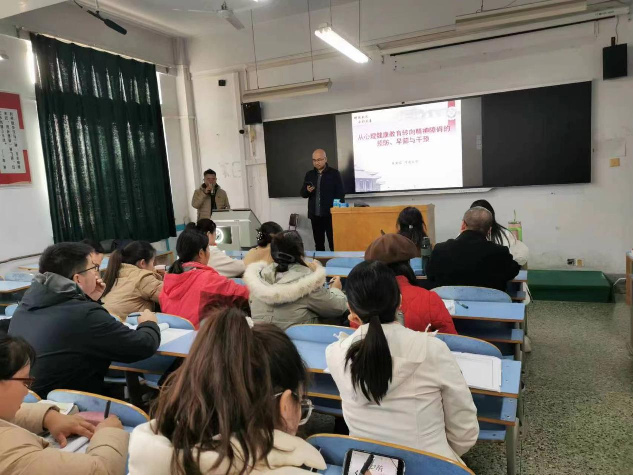 2023年11月26日下午,河南大学心理学教授朱湘茹为国培学员做了一场题为“从心理健康教育走向精神障碍的预防和干预”的专题讲座,讲座由教育学院国培项目班主任崔广立主持。