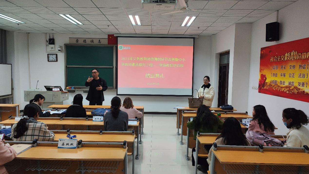 2024年3月28日,由教育学院承办的2023年义务教育师资薄弱环节改善暨中小学教师素质提升工程——学前教育培训班结业典礼在许昌学院E106教室举行。教育学院院长张笑涛,培训班班主任王贺锋、陈建军及全体参训学员参加了结业典礼。结业典礼由班主任王贺锋主持。