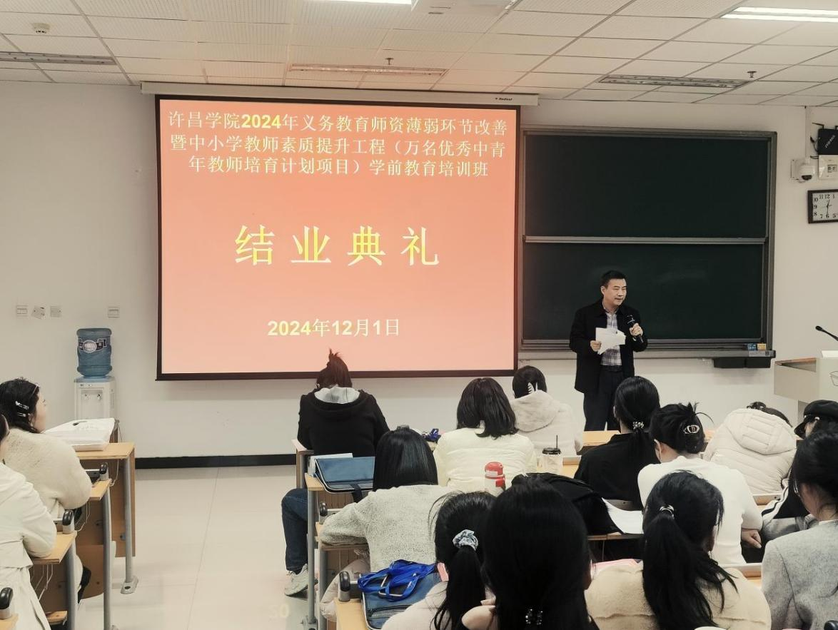 2024年12月1日上午,由许昌学院承办2024年义务教育师资薄弱环节改善暨中小学教师素质提升工程(万名优秀中青年教师培育计划项目)学前教育培训班结业典礼,在许昌学院E209教室举行。教育学院教育学教研室主任徐来群教授、本期培训班的班主任及全体参训学员参加。结业典礼由教育学院教师教育教研室主任王贺锋主持。