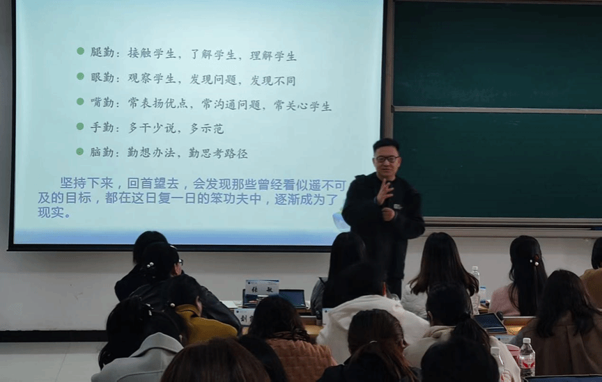 在报告中,刘忠伟校长系统阐述了班主任如何通过“讲故事”提升育人能力。首先,班主任要讲好自己的故事。刘校长指出,班主任要肯下“笨功夫”,做到腿勤、眼勤、嘴勤、手勤、脑勤,在日常实践中锤炼育人本领。他指出,“笨功夫”不仅是一种工作方法,更是一种专业精神,需要教师在长期坚持中不断积累、扎实成长。其次,班主任要讲好学生的故事。刘校长认为,班主任要善于讲述学生的成长故事,通过真实、温暖的教育叙事,让每个孩子感受到成长的可能,遇见生活中的美好,在积极体验中建立自信与幸福感。最后,班主任要让自己变得更有故事。刘校长进一步指出,教师要通过广泛阅读、勤于写作、深入思考、系统提炼,逐步形成个人教育风格,成为“有故事”的教育者。