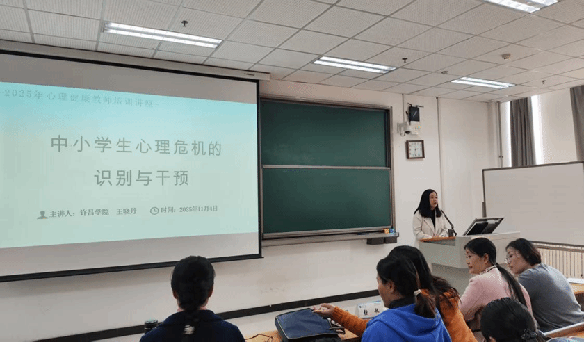2025年11月4日下午,许昌学院应用心理学系王晓丹副教授应邀为小学心理健康国培学员作《中小学生心理危机的识别与干预》的专题讲座。本次讲座由教育学院马来祥老师主持。