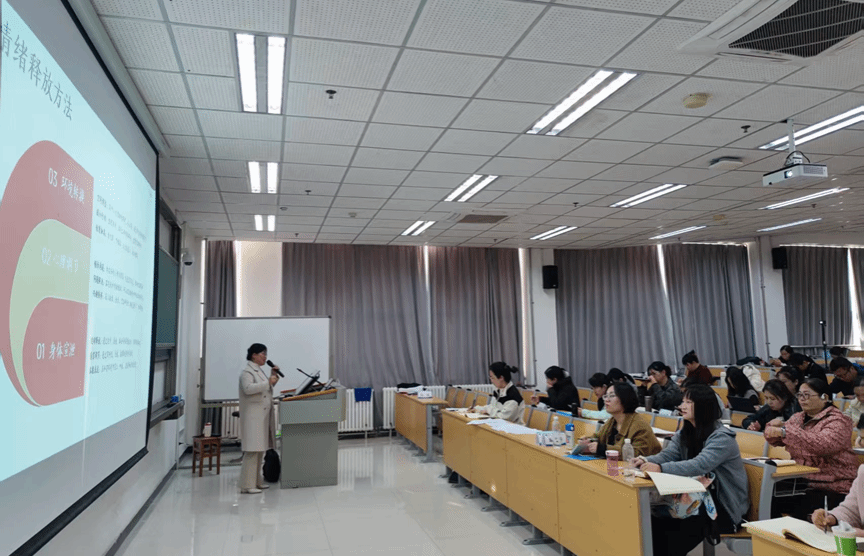 寇淑华校长从“自我认知—调适有方—点亮幸福”三个维度系统展开,引导教师正视职业压力、掌握心理调节方法、探寻幸福成长路径。她首先剖析了当前小学教师面临的多重压力源,包括家长沟通、学生管理、教学任务与职业发展焦虑等,并结合调研数据指出教师群体心理健康问题的普遍性与隐忧,强调负面心态对师生关系与教育生态的潜在影响。