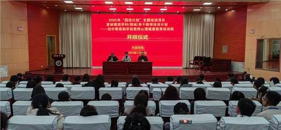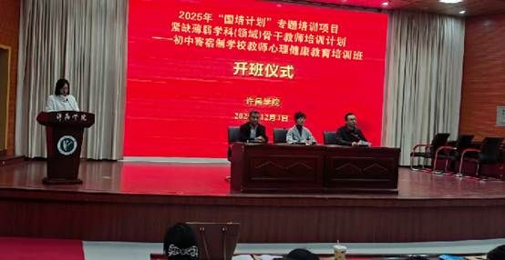 12月1日上午,“国培计划(2025)”紧缺薄弱学科(领域)骨干教师专项培训计划—初中寄宿制学校教师心理健康教育培训班开班仪式在许昌学院学术报告厅隆重举行。教育学院党委书记韦薇、教育学院党委副书记陈荣华、教育学院教育学教研室主任徐来群等领导及本期培训班全体参训学员参加,开班仪式由教育学院党委副书记陈荣华主持。
