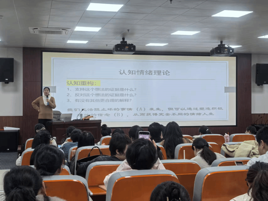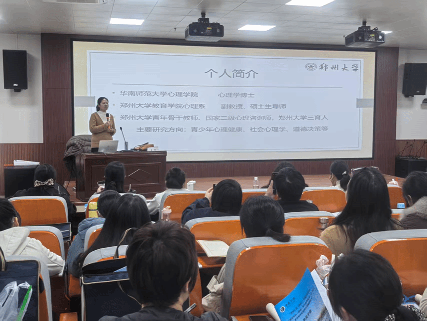2025年12月1日下午, 郑州大学王悦博士以《穿越压力风暴,塑造阳光心态》为题,引导教师关注自身心理调适,更深入探讨如何识别与应对青少年心理危机。