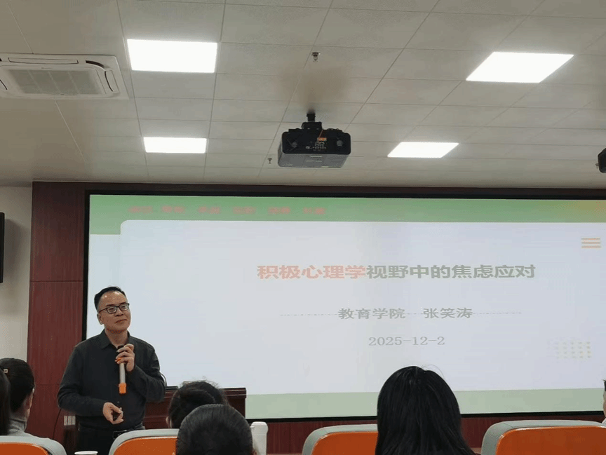 2025年12月2日下午,许昌学院教育学院张笑涛院长以“走近积极心理学”为主题,带来一场关于“幸福科学”的深度讲座。张院长从积极心理学的核心理念与实践方法入手,引导老师们重新思考心理健康的方向——从“消除痛苦”转向“建构幸福”。