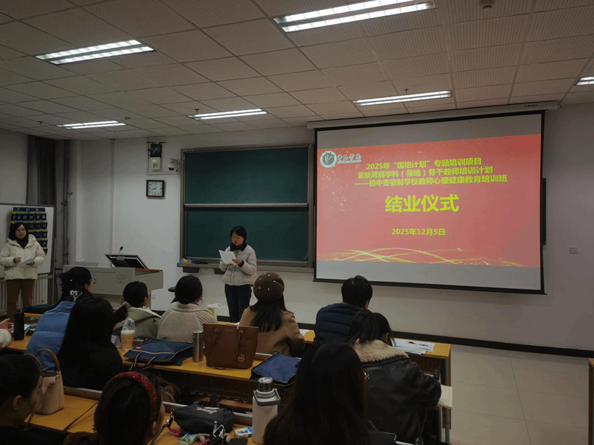 12月5日上午,由许昌学院承办的“国培计划(2025)”紧缺薄弱学科(领域)骨干教师专项培训计划——初中寄宿制学校教师心理健康教育培训结业仪式顺利举行。教育学院副院长刘培蕾,国培班主任刘畅、张学琴以及国培全体学员参加了仪式,赵学琴老师主持了仪式。