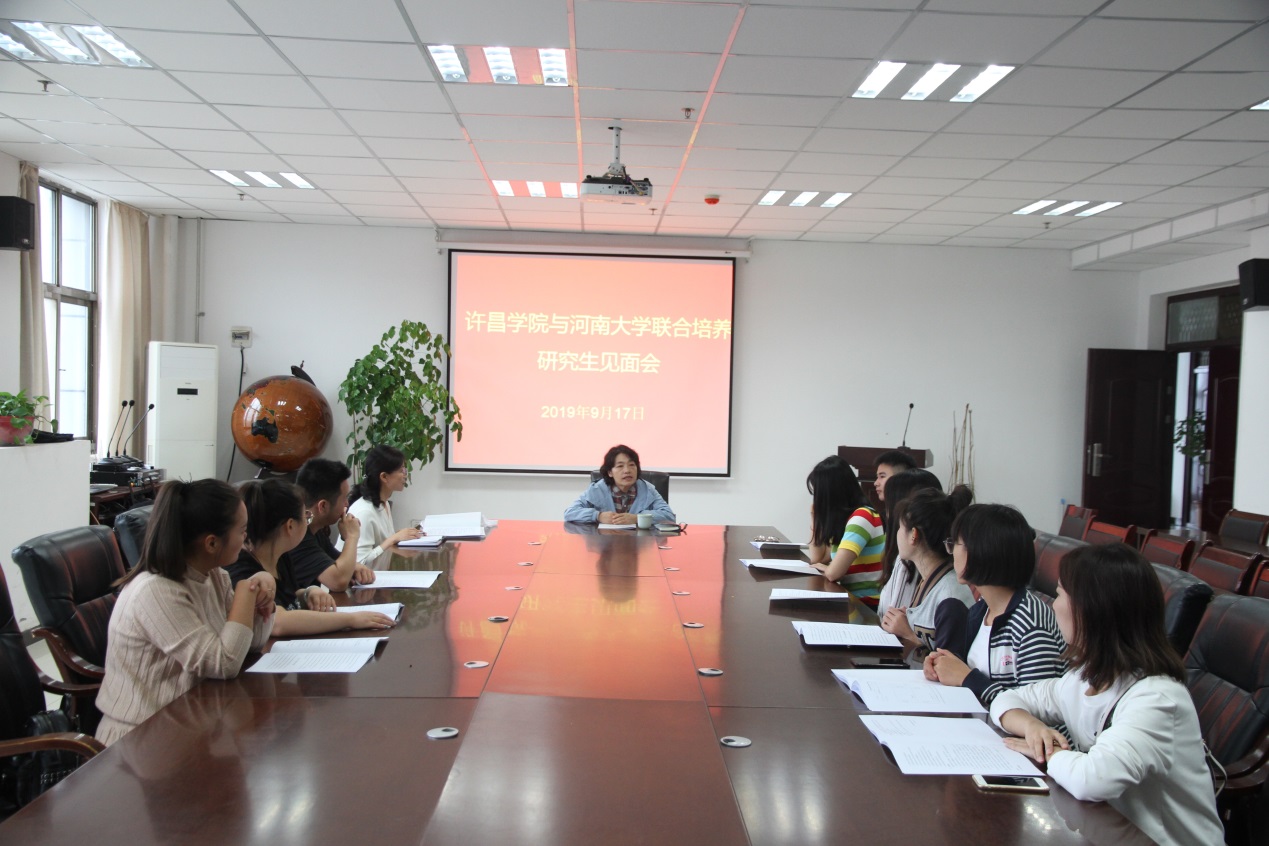 李晓慧院长首先对9名联合培养研究生的到来表示热烈欢迎。在会上,李晓慧院长充分肯定了联合培养研究生的意义和价值,她指出联合培养研究生可以充分发挥河南大学与许昌学院的各自优势,能够切实保证和提高硕士研究生培养质量。因此,她期望许昌学院与河南大学联合培养研究生的这项双赢工作能够高效、持续推进,两校因联合培养而建立起来的深厚友谊也能够进一步稳固与升华。李松副院长针对联合培养研究生在校期间应该完成的学习与科研任务,享有的待遇、指导教师的具体职责、应遵守的纪律以及毕业考核内容等作出了详细的介绍和说明。