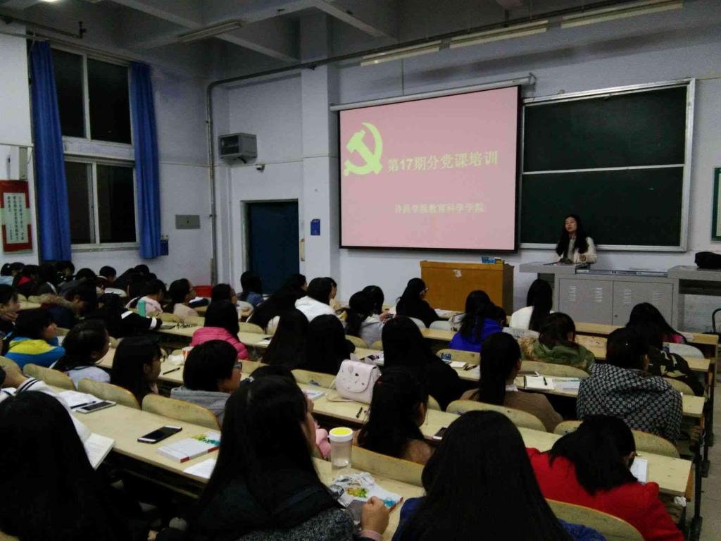 教育科学学院第17期分党课培训于2016年10月9号至10月18号在A3-306、艺术楼104等教室成功举办,本次分党课培训由教育科学学院党总支副书记李晓鹏、团总支副书记李征,学生第四党支部书记袁朝阳等多位老师亲临授课,参加十七期分党课培训的39名入党积极分子全部到场。