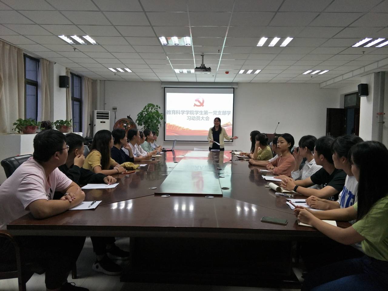 2019年9月23日教育科学学院学生第一党支部在文科综合楼1621召开学习动员大会,参会的人员为该支部的全体成员。会议由学生第一党支部书记袁朝阳老师主持。