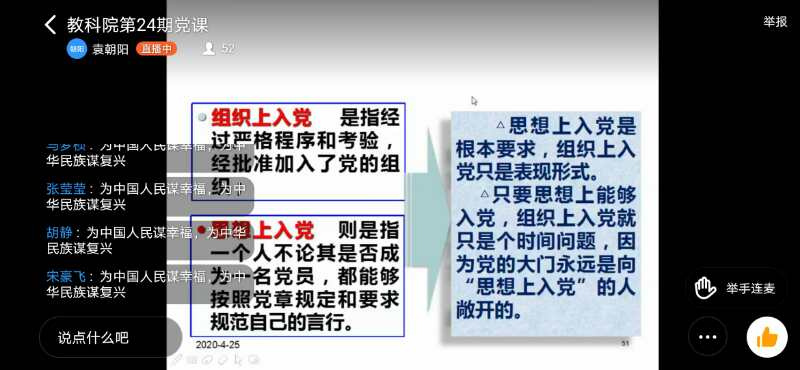 为切实加强我院入党积极分子对党的认识和党性修养,端正入党动机,2020年4月25日上午,我院采用网络授课方式在线上举办《我为什么要加入中国共产党》分党课专题讲座。此次讲座由我院2019级专升本辅导员袁朝阳主持,我院51名入党积极分子参与此次讲座。