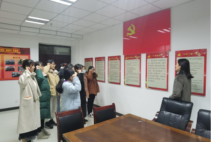 预备党员接收大会结束后,学生第二党支部书记赵文慧带领陈艳玲、寿喆、张舒聘等10名等预备党员在文综楼1620党员活动室进行宣誓活动。预备党员们面对鲜红的党旗,在领誓人的带领下庄严宣誓,表达了他们对党的无限忠诚与热爱。宣誓活动结束后,10名预备党员进行了表态发言。