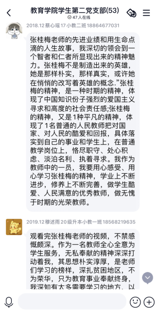 2019级学生党员魏一说:“张桂梅老师让更多的女生有了梦想、有了可以选择的权利,传递的是爱和阳光。她用自己的青春换来了1000多名贫困女孩迈向了大学的校门的机会,她帮助孩子们改变人生的轨迹,用双肩丈量责任的高度。她树立终身学习的态度,将当地的实际情况与先进的教育经验结合,总结出一套适合民族贫困山区的教学方法。她爱学生胜过爱自己,经常超负荷的工作状态,病痛缠身却依然坚持在教学岗位上。张桂梅用自己的实际行动践行共产党员的使命与担当。作为一名共产党员,一名即将步入教育事业的师范生,我要学习张桂梅老师的无私奉献的精神,为祖国的教育事业贡献自己的力量和价值。争取早日成为一名优秀的人民教师。”
