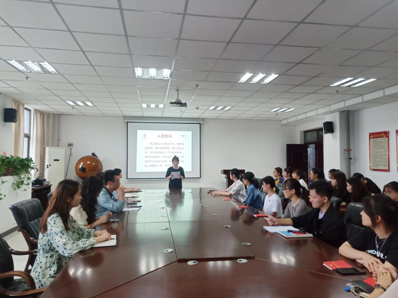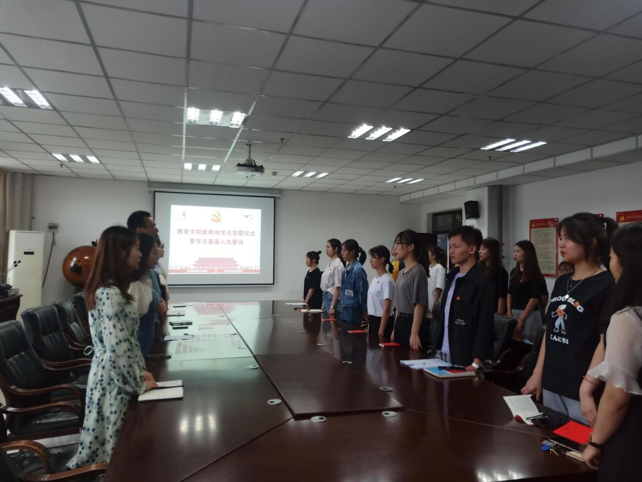院党委副书记陈荣华宣读了学校党委关于批准预备党员的通知,并对36名新党员加入党组织表示热烈祝贺。党委书记韦薇带领新党员面向党旗宣誓,全体与会党员同志们也重温了入党誓词,八十个字的入党誓词永远铭记在党员心中。