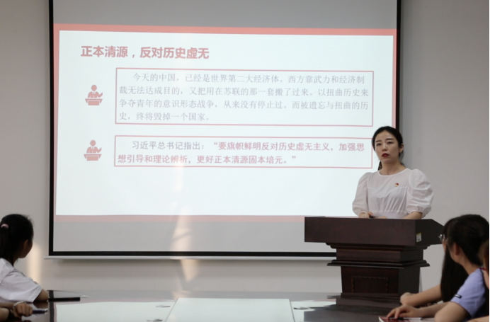 其中,李征书记重点向同学们讲述了历史虚无主义的本质及危害,学生以此为主题进行了发言交流。李征书记总结到,我们必须旗帜鲜明地坚持唯物史观的理论指导,同历史虚无主义进行坚决彻底的斗争,深刻揭露其错误和荒谬。“虽有智慧,不如乘势。”只有理解历史才能看得远,理解历史才能走得远。我们青年一代绝不可忘记历史,要以史为镜,学史明理,思想先行。