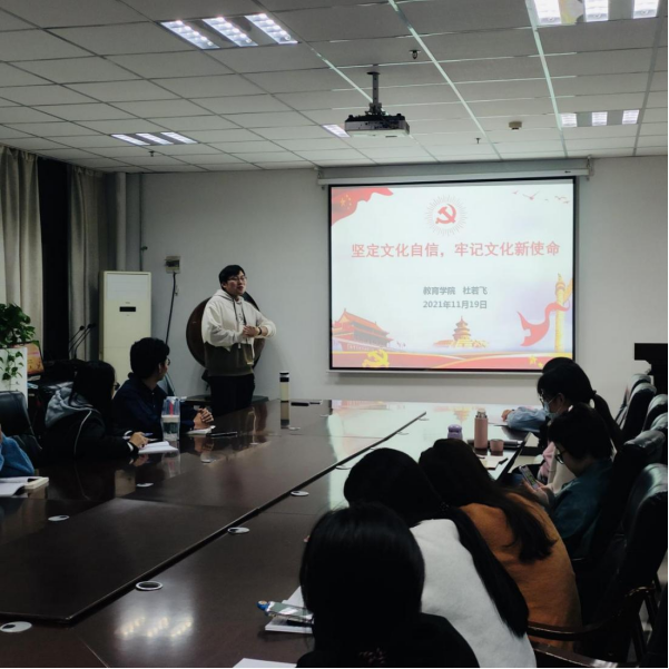 11月19日下午,我院教师杜若飞结合自己学习、工作体会,从“中国共产党党员的初心和使命是什么”、“坚定文化自信,实现民族复兴”、“意识形态工作”等几方面阐述了共产党员的初心和使命。他强调文化自信的底气就在于博大精深的优秀传统文化,鲜明独特、奋发向上的革命文化,以及承前启后、继往开来的社会主义文化。作为一名新时代大学生,更应该将“弘扬中华优秀传统文化”视为己任,并为之做出努力。