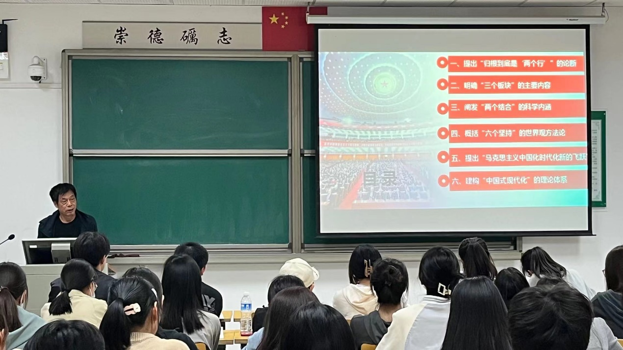 4月10日晚上,中原农耕文化与乡村发展研究基地主任寇鸿顺以“马克思主义理论发展新境界”为主题开展专题党课,课上寇老师首先并提出了三个问题,是什么?为什么?怎么开拓? 引发思考,随后从六个方面:“归根到底是两个行”的论断;明确“三个板块”的主要内容;阐发“两个结合”的科学内涵;概括“六个坚持”的世界观方法论;提出“马克思主义中国化时代化新的飞跃;建构“中国式现代化的理论体系”逐个展开讲解。