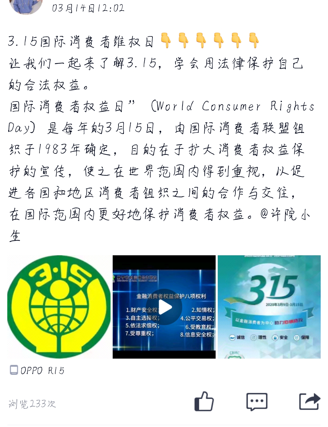 本次活动以“保消费权益,守网络健康”为主题,旨在通过制作视频,观看书籍以及转发讨论等方式帮助同学们进一步了解有关消费者权益的知识内容,加强同学们对消费者权益的认识。活动期间,团总支学生会权益心保部成员们针对同学们的疑惑和讨论进行回复,向同学们宣传普及维权知识和途径以及与大学生息息相关的维权小技巧等,帮助同学们提高消费维权意识,学会正确维护自身的合法权益。