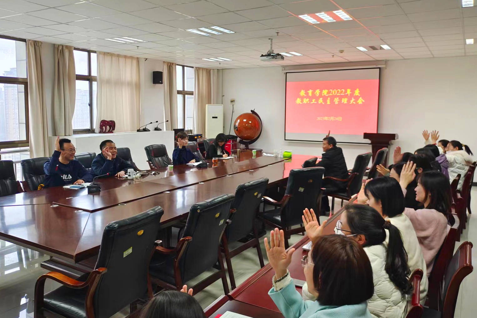 2023年2月24日下午,教育学院第四届第二次教职工暨工会会员民主管理大会在文综楼1621会议室召开,教育学院党委书记、分工会主席韦薇代表单位和分工会分别作了工作报告。