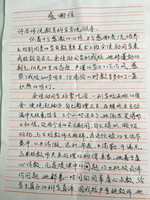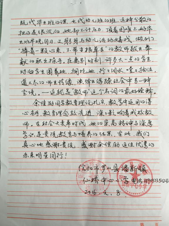 近日,我院收到来自信阳市罗山县潘新镇仙桥中心小学寄来的感谢信,对我院余佳励同学在顶岗实习期间的工作表现表示感谢。