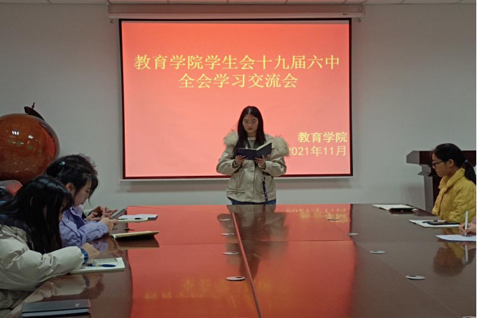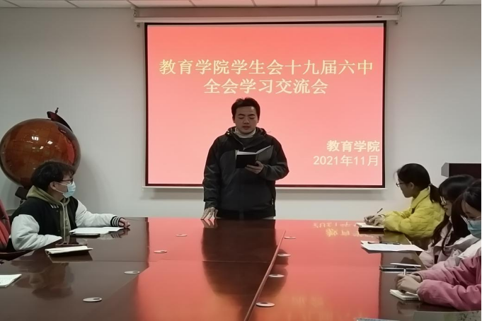 为深入贯彻学习党的十九届六中全会精神,提高我院学生会工作人员思想政治素养,2021年11月22日晚,我院于E-1621开展教育学院学生会学习党的十九届六中全会精神交流会。