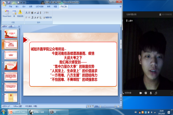活动中,各年级在辅导员的带领下,通过PPT来向同学们就“开学思政第一课”这一主题展开讲解,带领同学们回顾了此次防汛防疫中的伟大事迹,更好地体会到“我们安宁的生活是因为有人在替我们负重前行”这句话的真正含义,并通过观看视频等方式,使大家能够更加直观地感受到中国共产党的力量、中国人民团结一心的精神。同学们也积极发言,与大家分享自己的感悟,为我们的祖国感到骄傲和自豪。